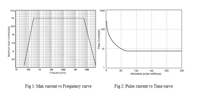 | Max Pulse Current | 250Apk (Fig 2) Can’t surpass 500A*us or 5.3 Arms, or the magnetic core could saturate and unable to zero. |